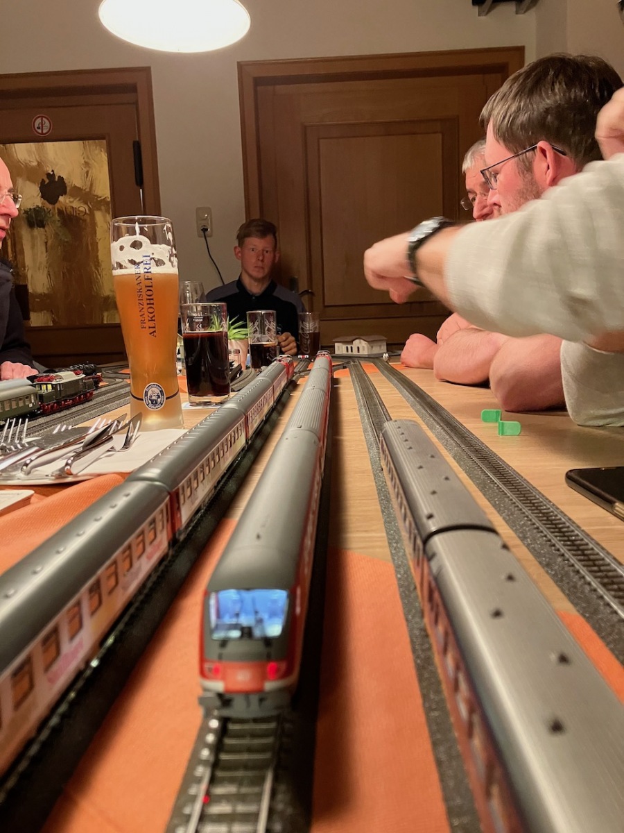 Einer unserer Mitstreiter hat auch gleich mal einen Satz lange gerade mitgebracht, so das wir unserer Tischbahn über den kompletten Tisch aufbauen konnten.