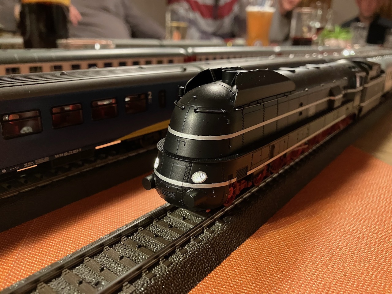 Einer unserer Mitstreiter hat auch gleich mal einen Satz lange gerade mitgebracht, so das wir unserer Tischbahn über den kompletten Tisch aufbauen konnten.