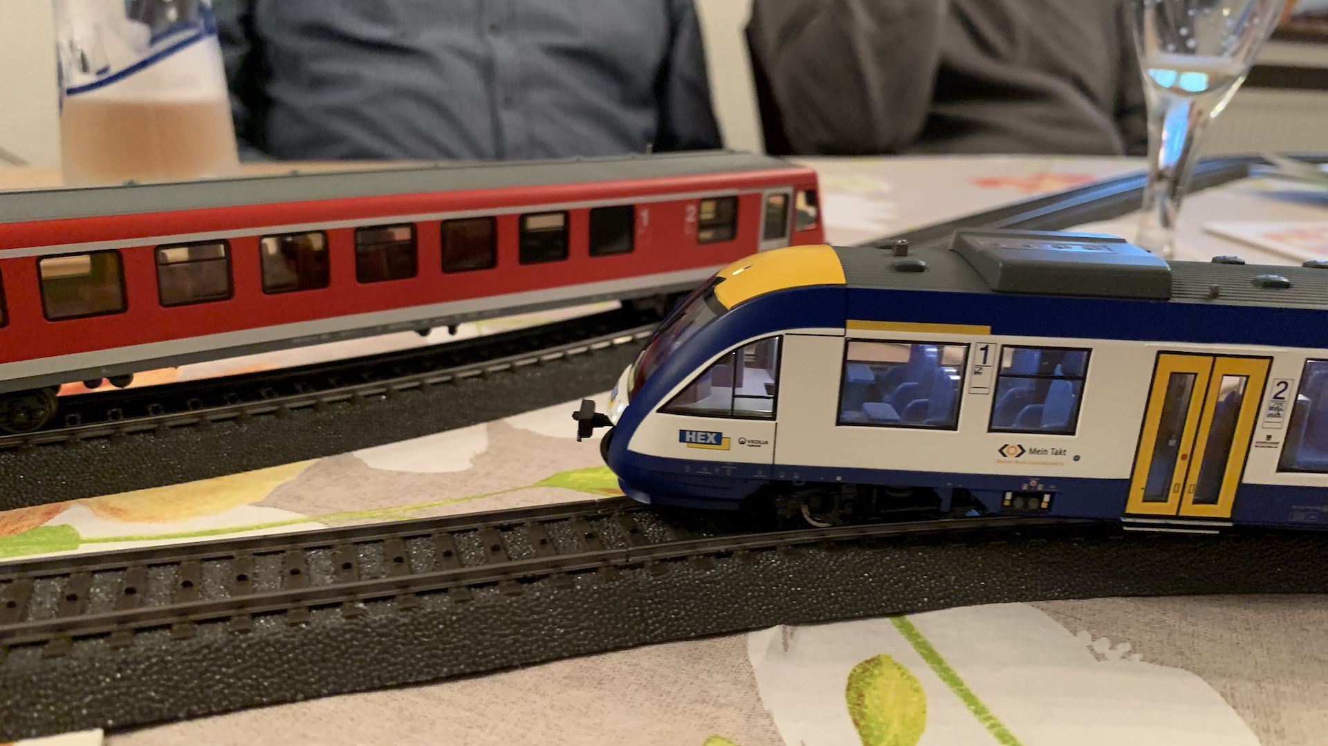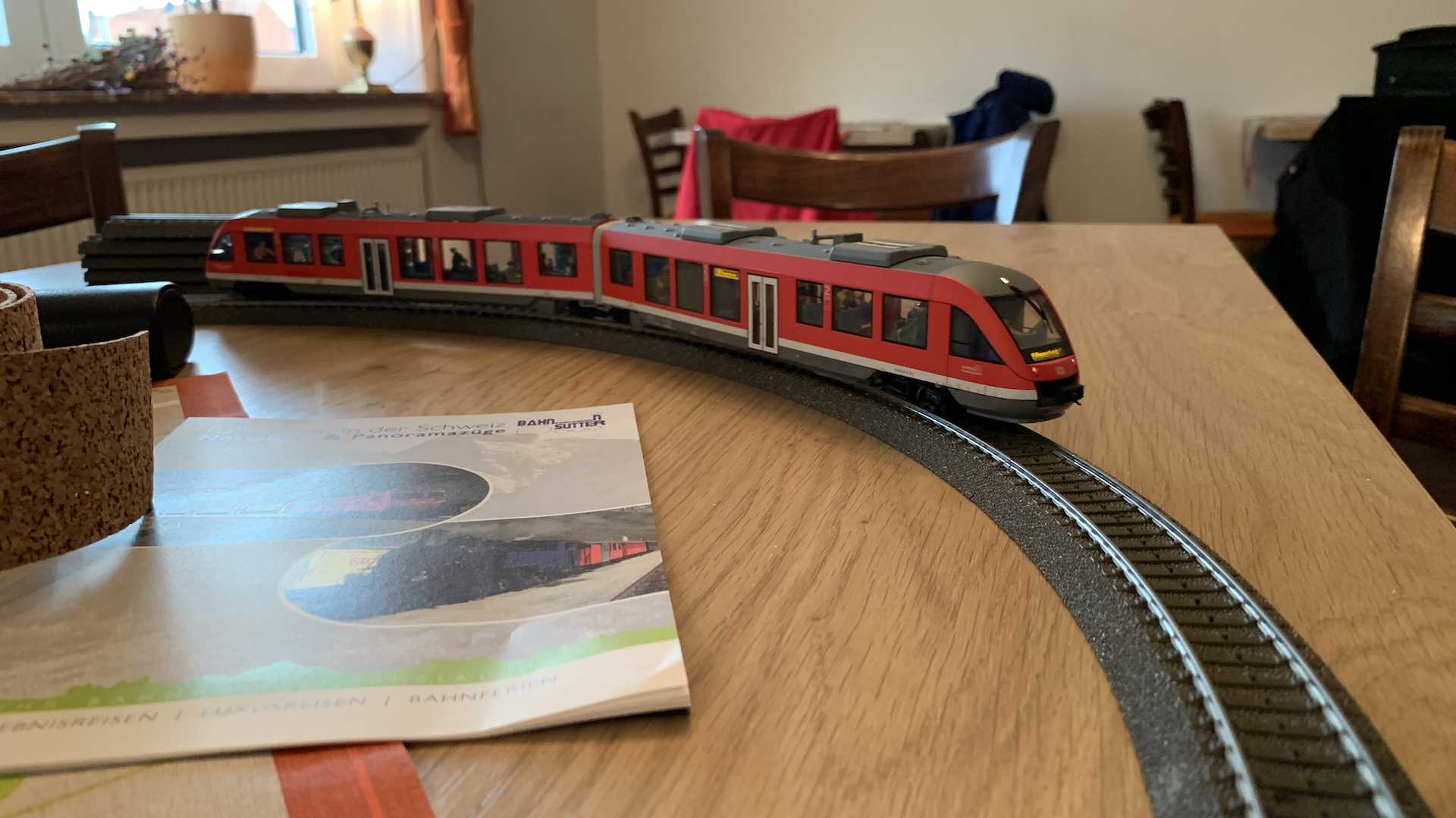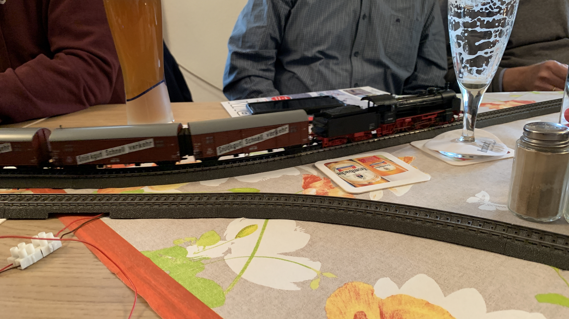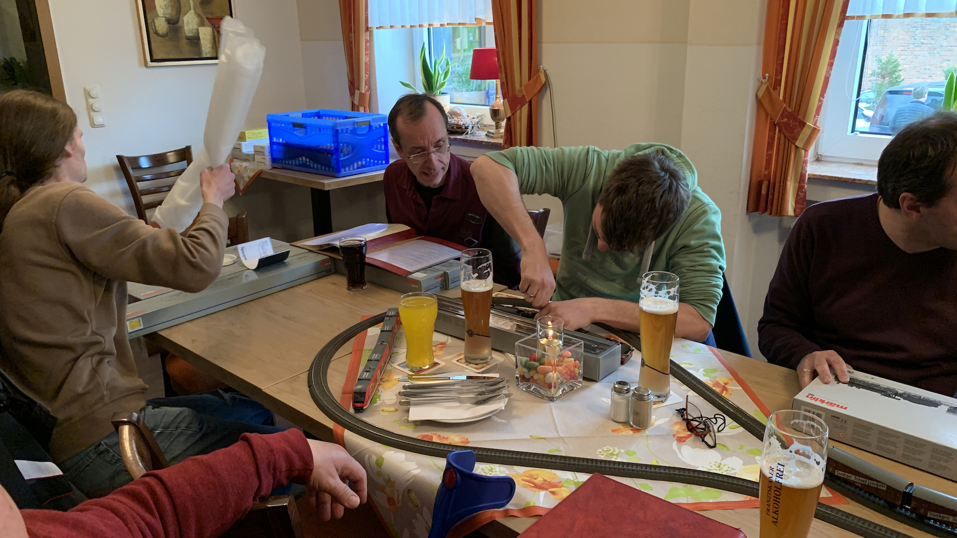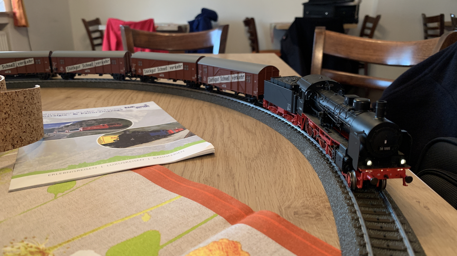 Im Frühstücksraum des Gasthauses sind leider die Tische nicht so breit, so dass wir nur eine eingleisige Strecke aufbauen konnten.