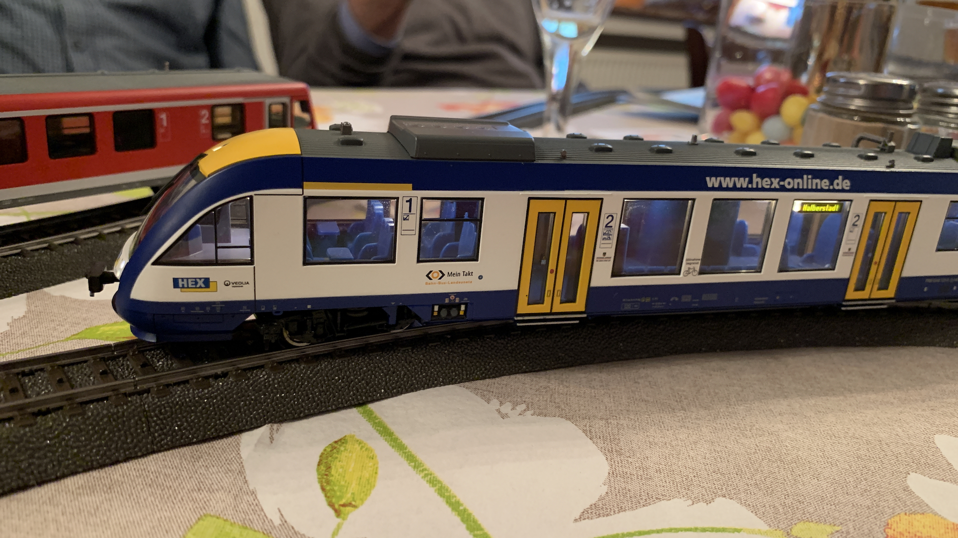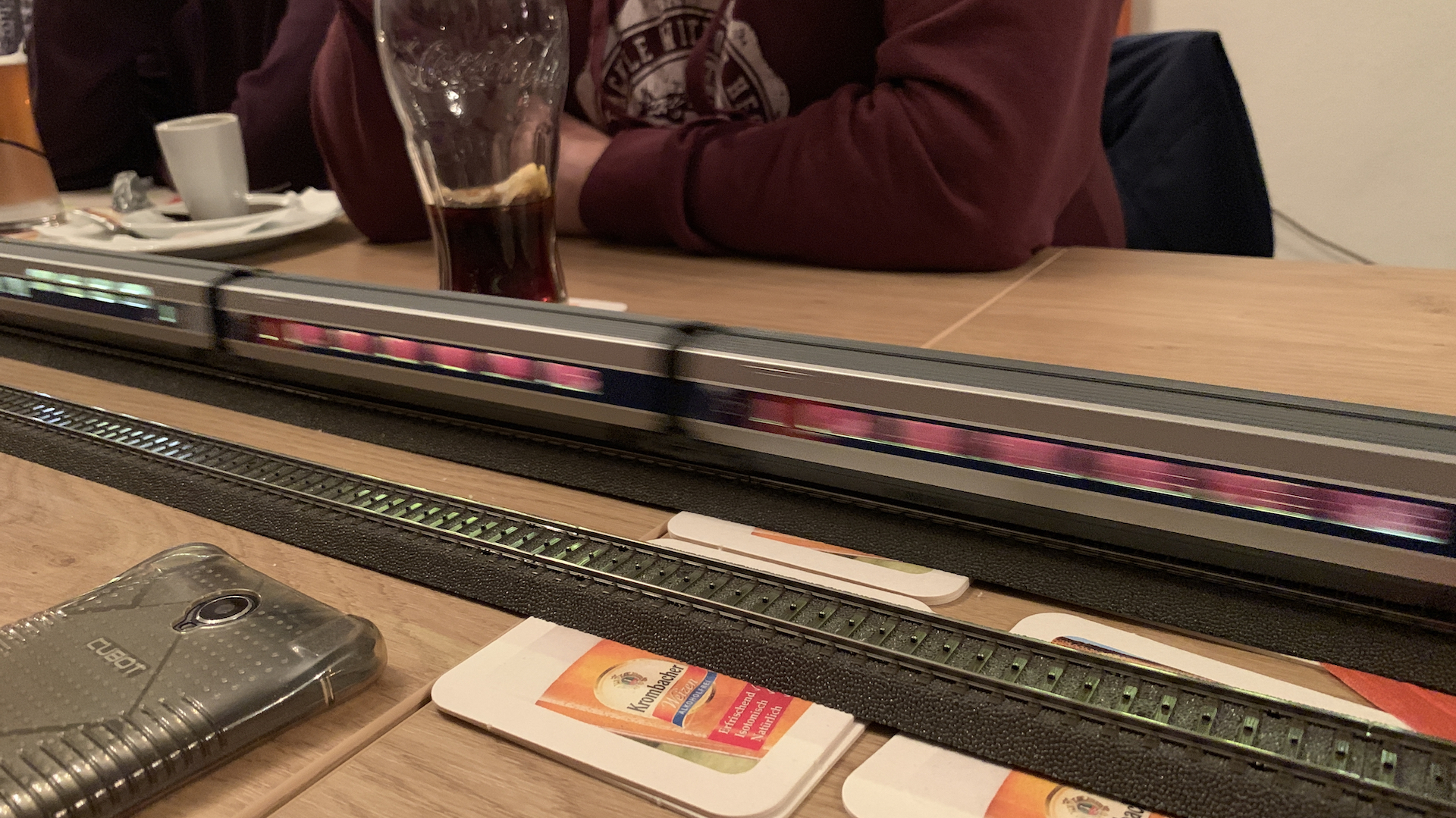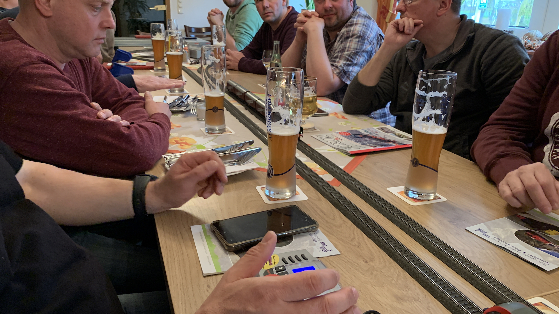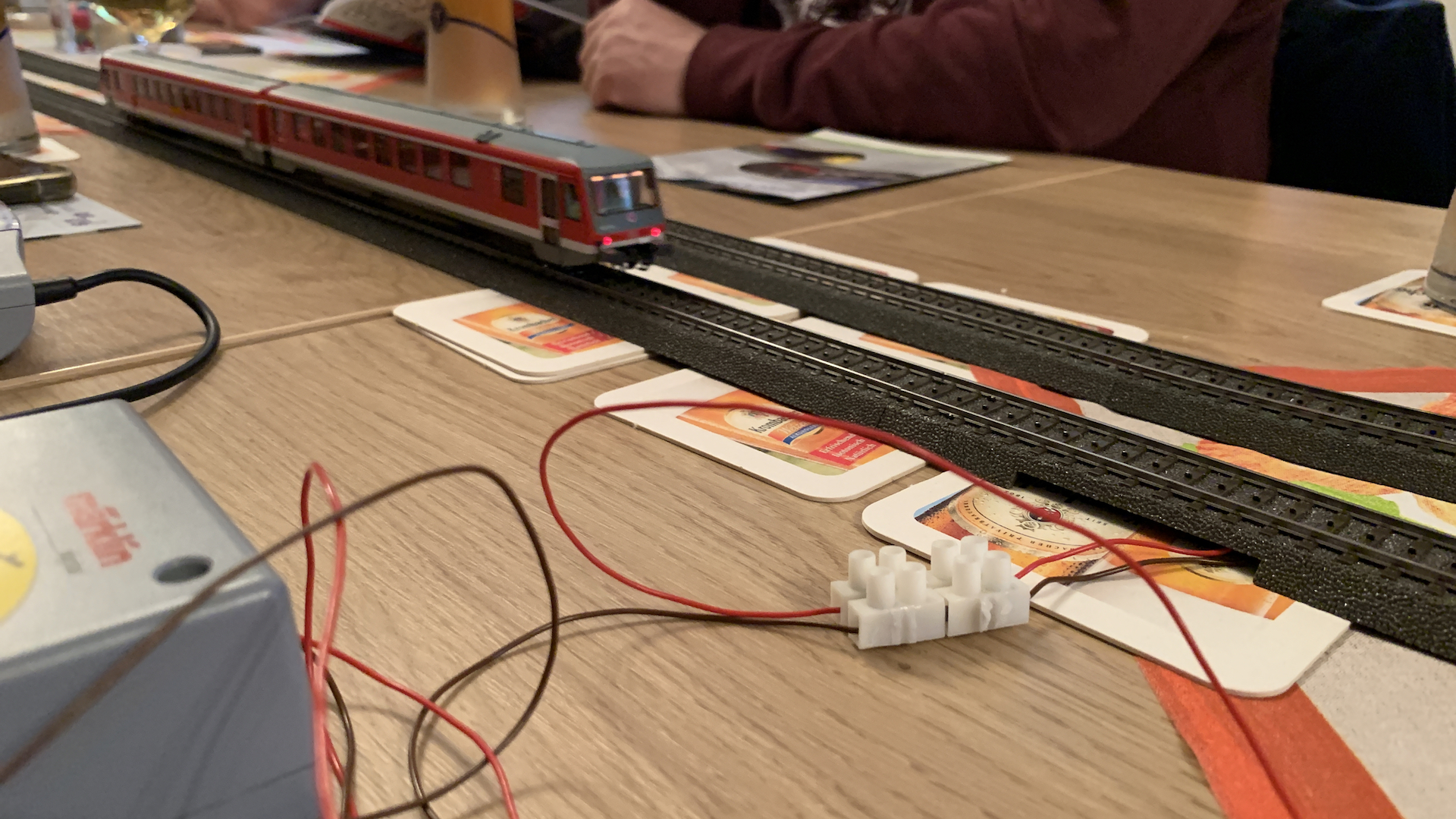 Im Frühstücksraum des Gasthauses sind leider die Tische nicht so breit, so dass wir nur eine eingleisige Strecke aufbauen konnten.