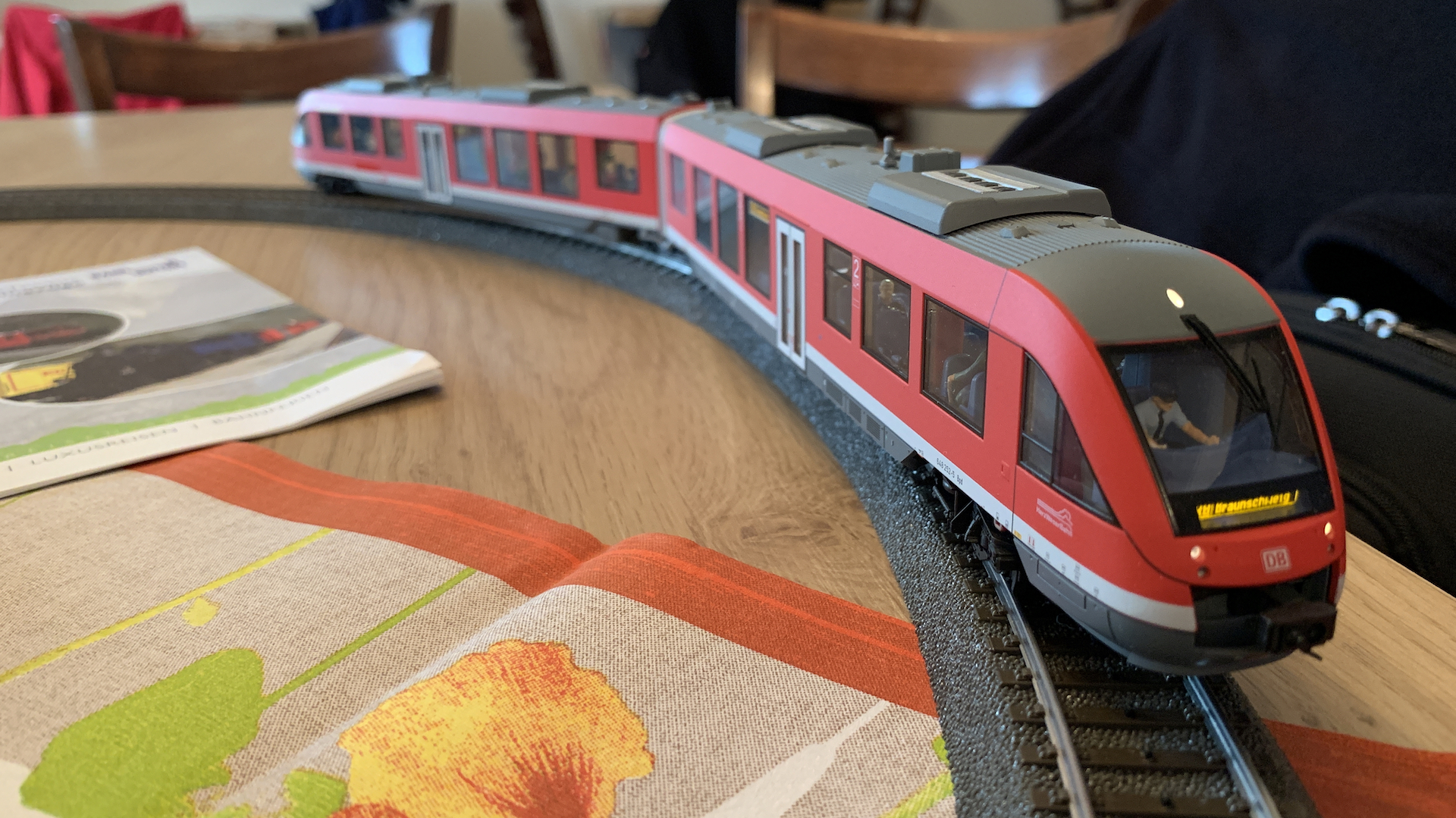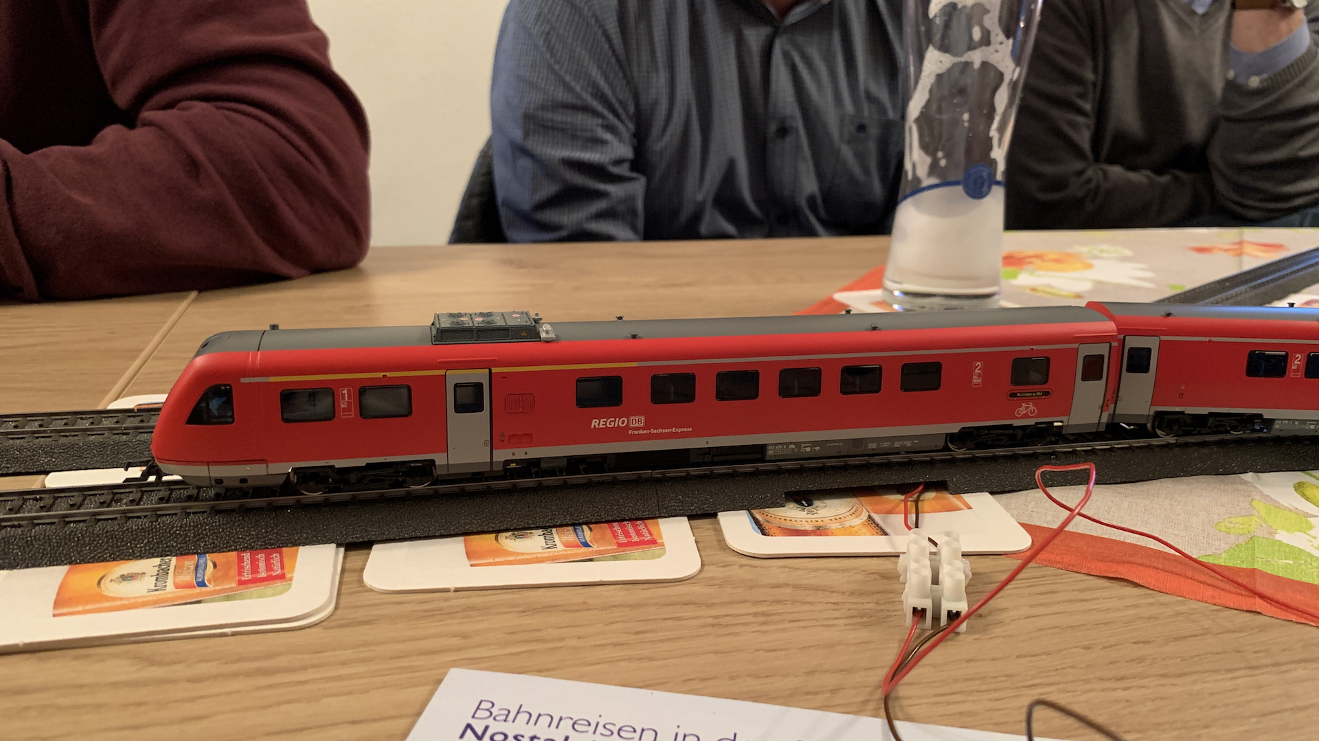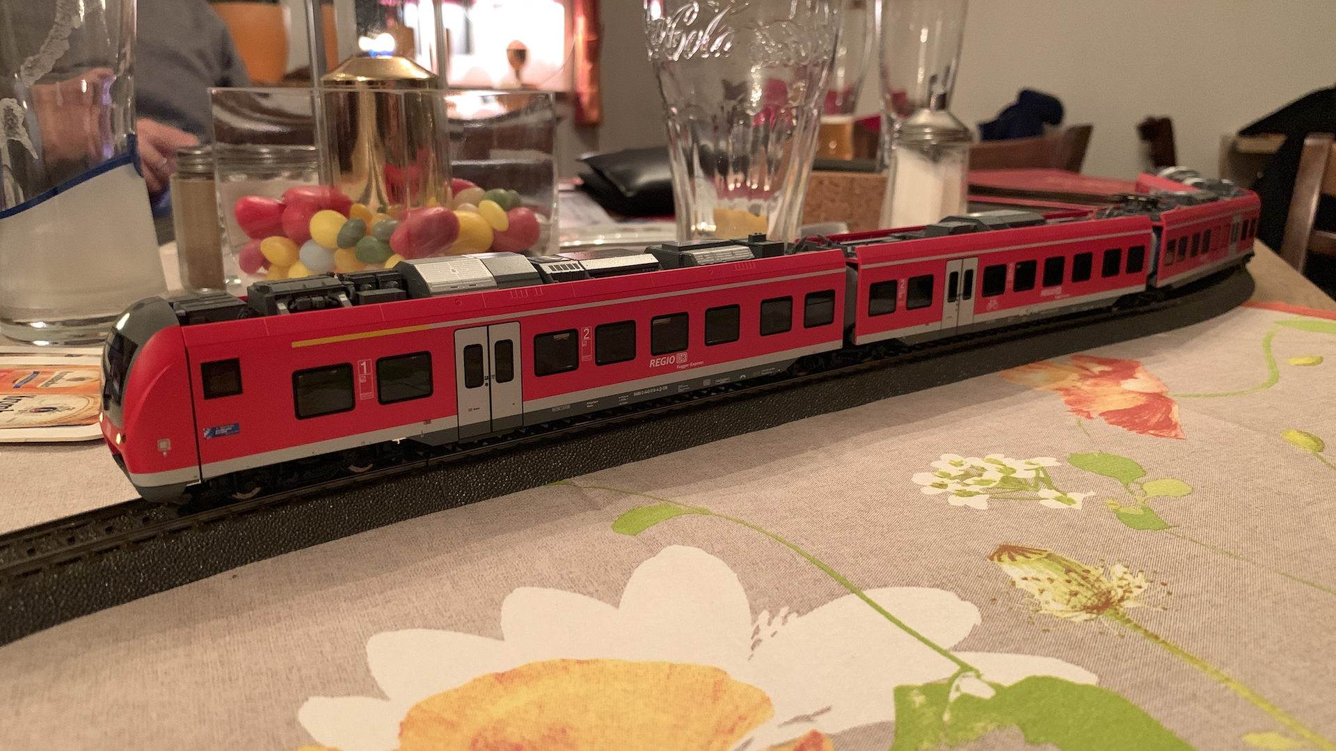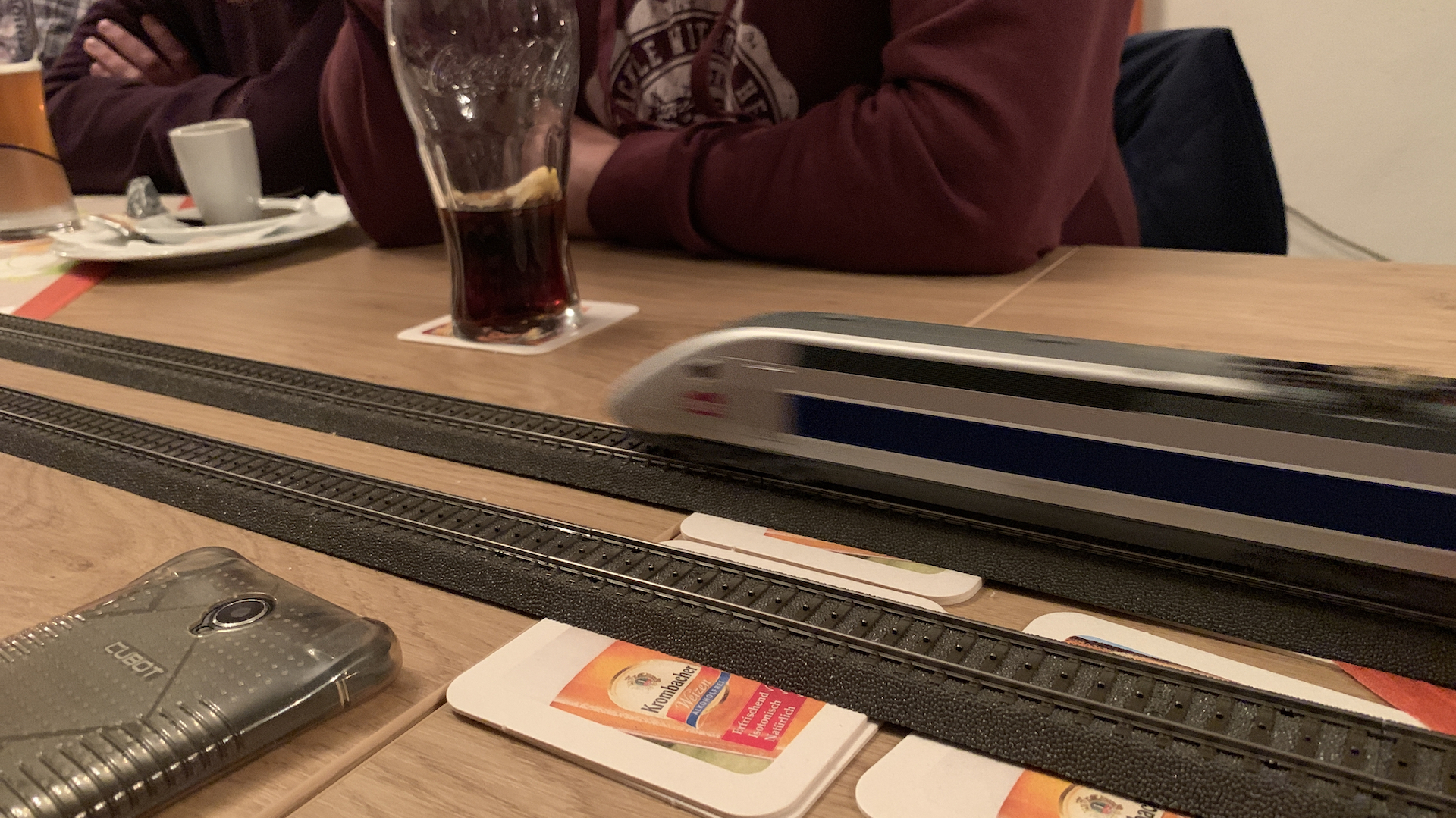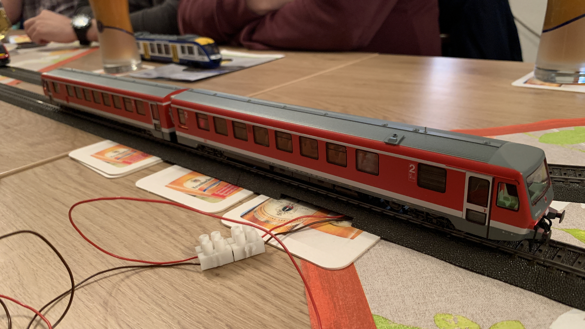 Im Frühstücksraum des Gasthauses sind leider die Tische nicht so breit, so dass wir nur eine eingleisige Strecke aufbauen konnten.
