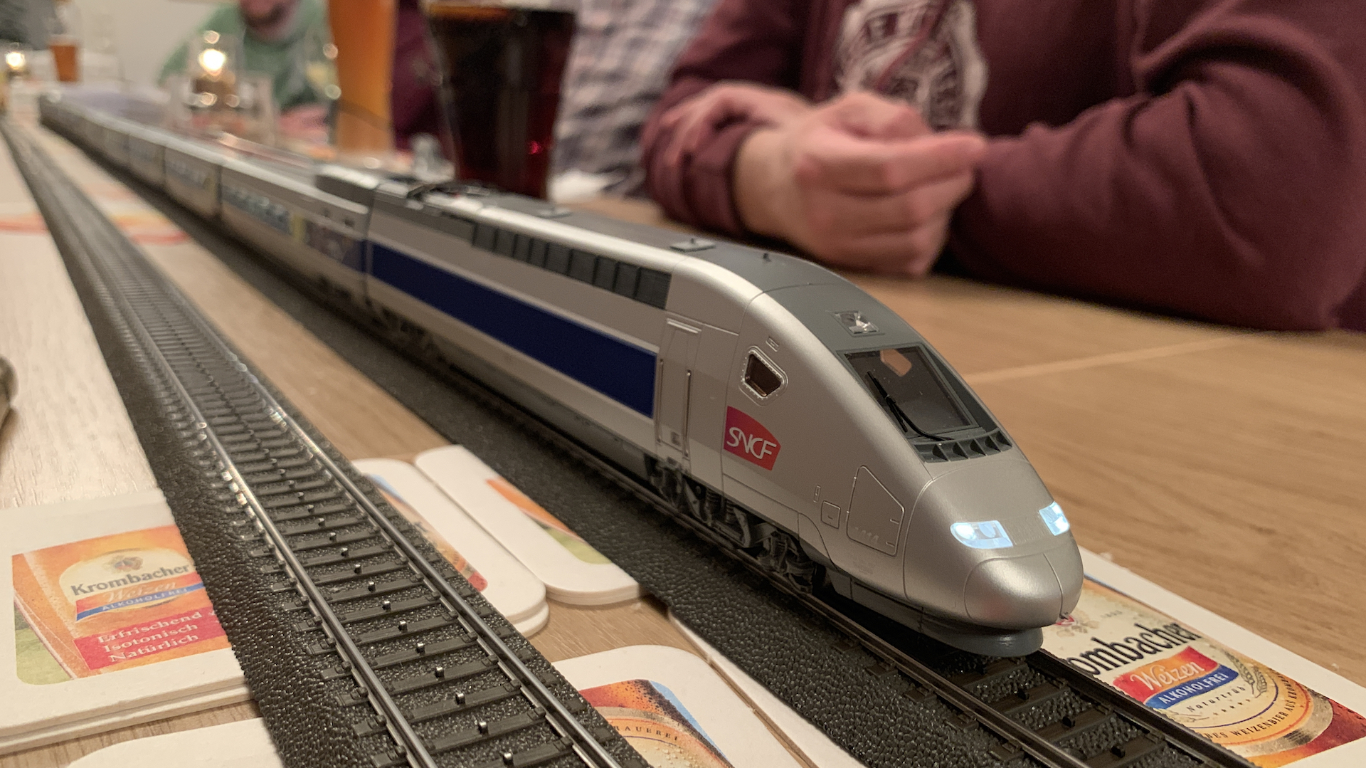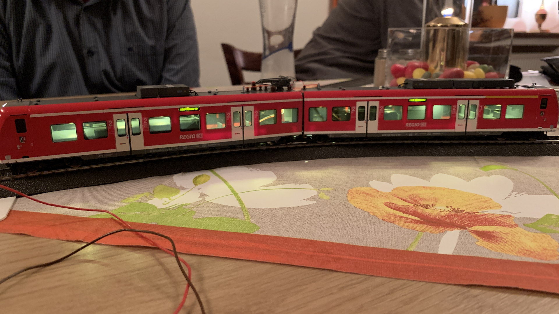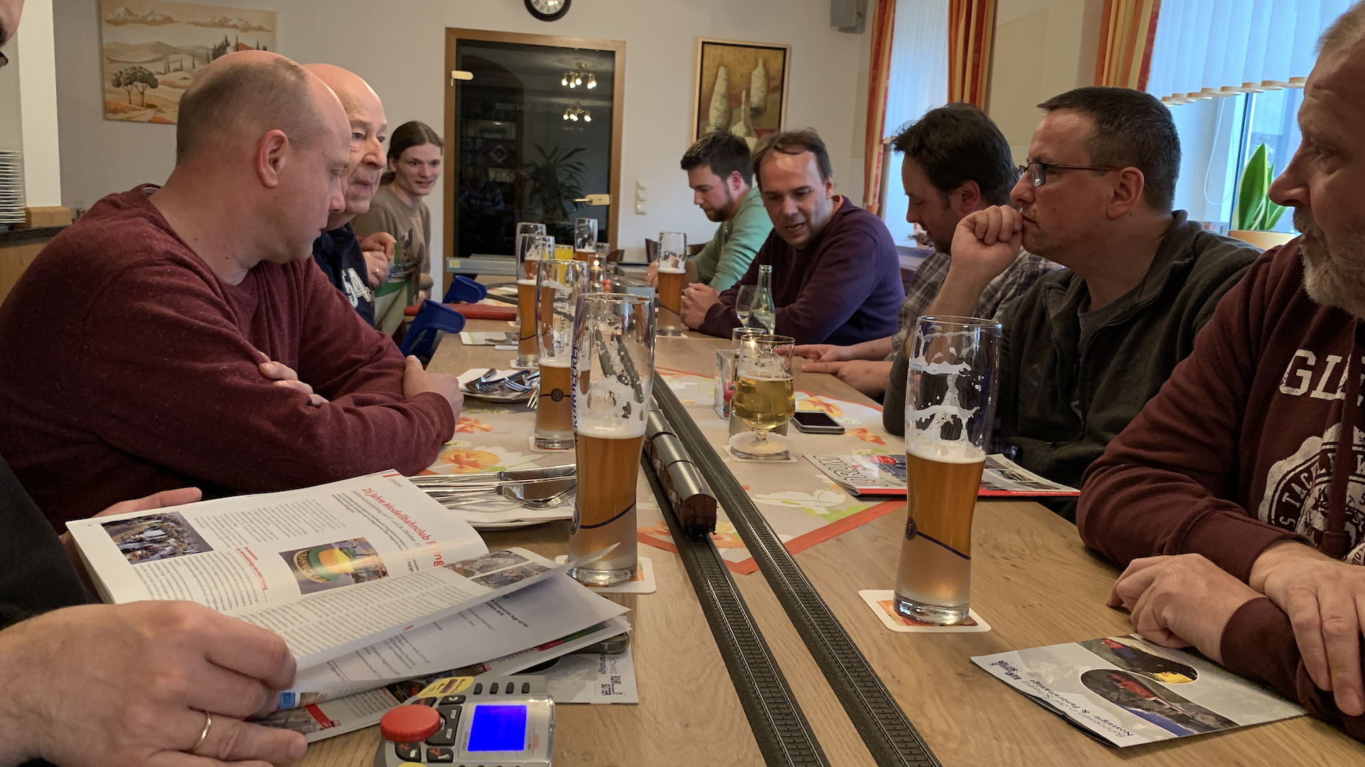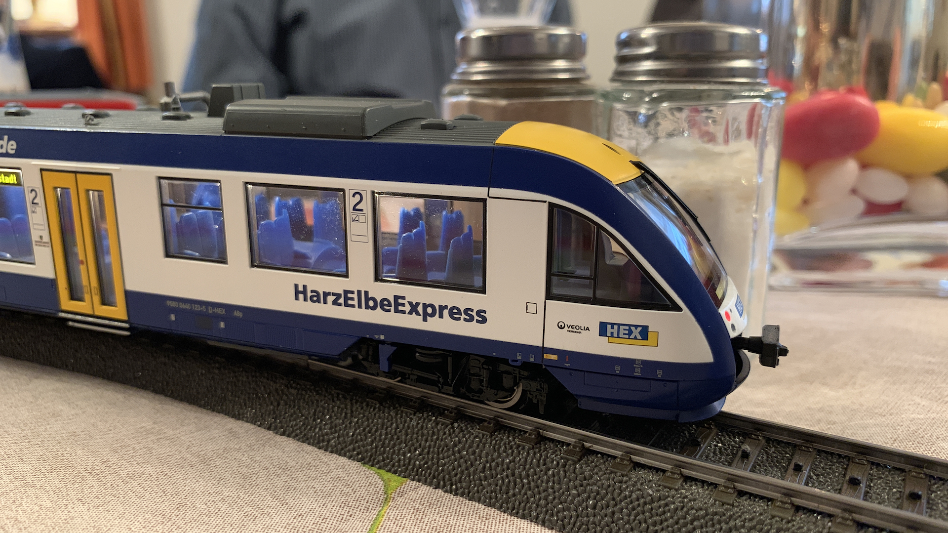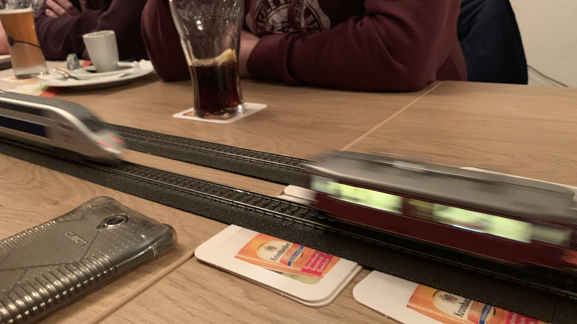 Im Frühstücksraum des Gasthauses sind leider die Tische nicht so breit, so dass wir nur eine eingleisige Strecke aufbauen konnten.